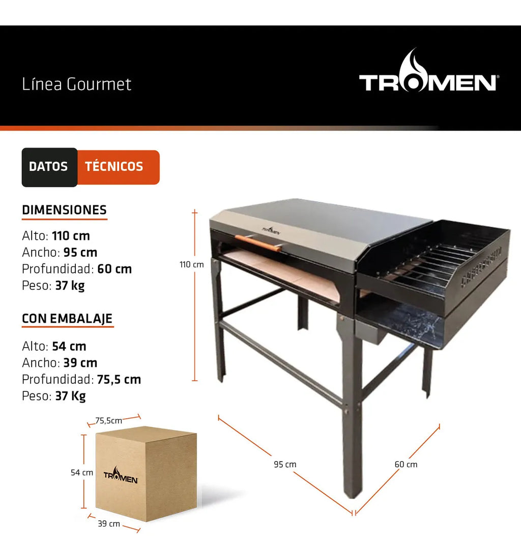 La parrilla ideal para amantes del asado: diseño compacto y robusto pensado para lograr el mejor sabor tradicional a leña, con control de temperatura gracias a su tapa y base con ladrillos refractarios que mejoran la retención térmica.