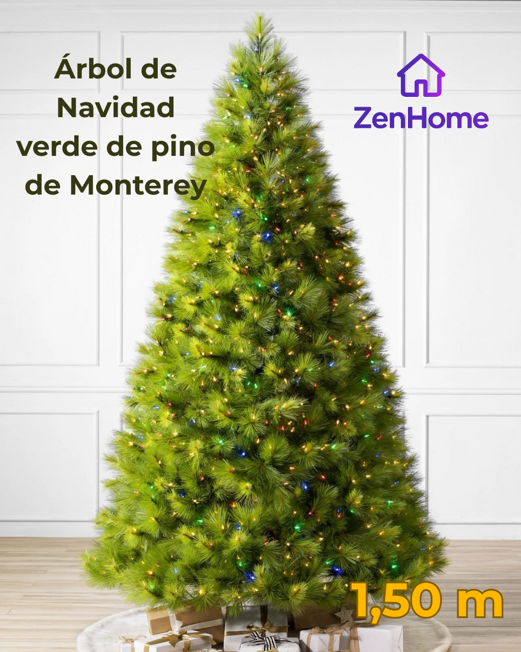 1,50m - Árbol de Navidad verde de pino de Monterey con ramas largas, soporte de metal y micro LED de colores integrados.